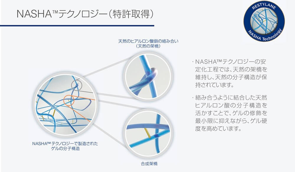 レスチレンは、このNASHAテクノロジーにより1%以下という極めて少ない架橋剤の割合でヒアルロン酸の硬さや持続性を実現させたヒアルロン酸製材です。